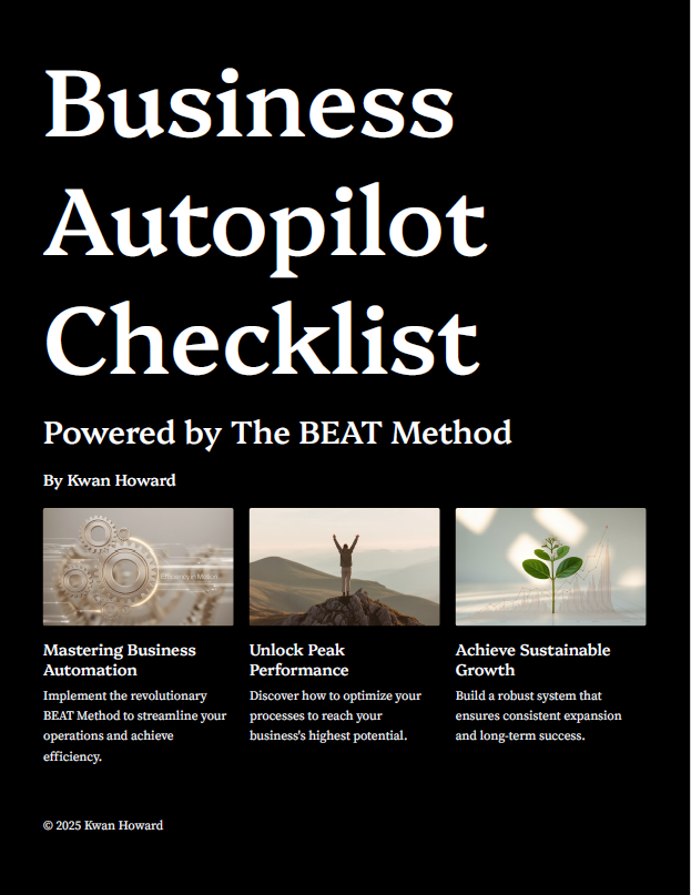 The Ultimate Business Autopilot Systems Checklist reveals exactly how to identify the operational bottlenecks that keep you trapped—and shows you the step-by-step BEAT Method to build self-sustaining systems. If you're ready to transform your business from a demanding job into a valuable asset that works for you, this checklist is your blueprint to more business, bigger profits, and an operation that virtually runs itself.